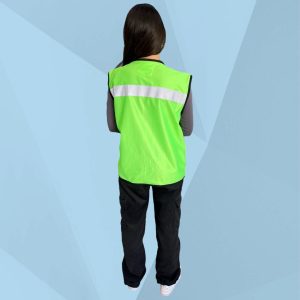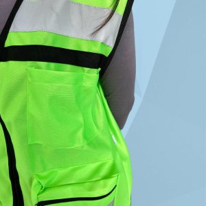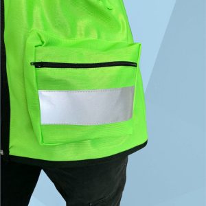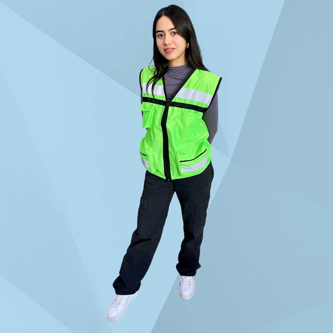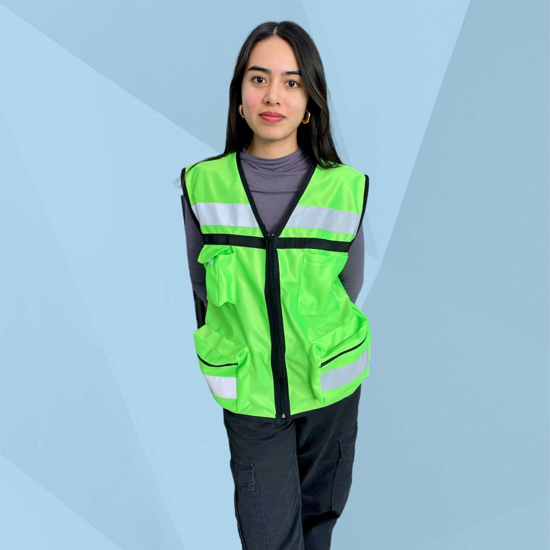 Está fabricado en tela 100% poliéster. Nuestro chaleco de seguridad cuenta con un cierre al frente, cinta anti reflejante a la altura del pecho, dos bolsas con cierre y tira anti reflejante en la parte inferior; una en cada lado, una bolsa con pegote en la parte superior derecha y otras dos bolsas sencillas de lado izquierdo.